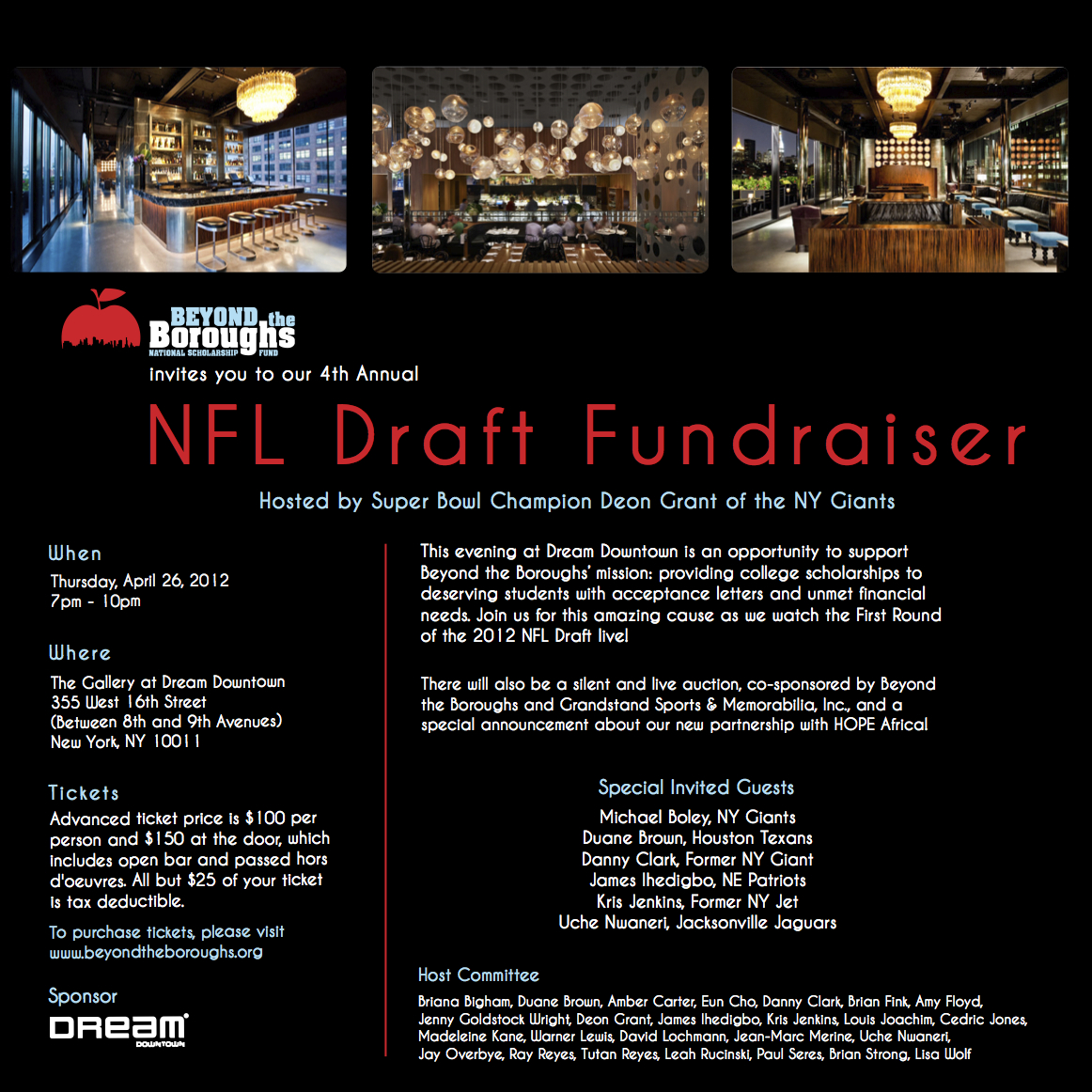 This evening at Dream Downtown is an opportunity to support Beyond the Boroughs' mission: providing college scholarships to deserving students with acceptance letters and unmet financial needs. Join us for this amazing cause as we watch the First Round of the 2012 NFL Draft live!